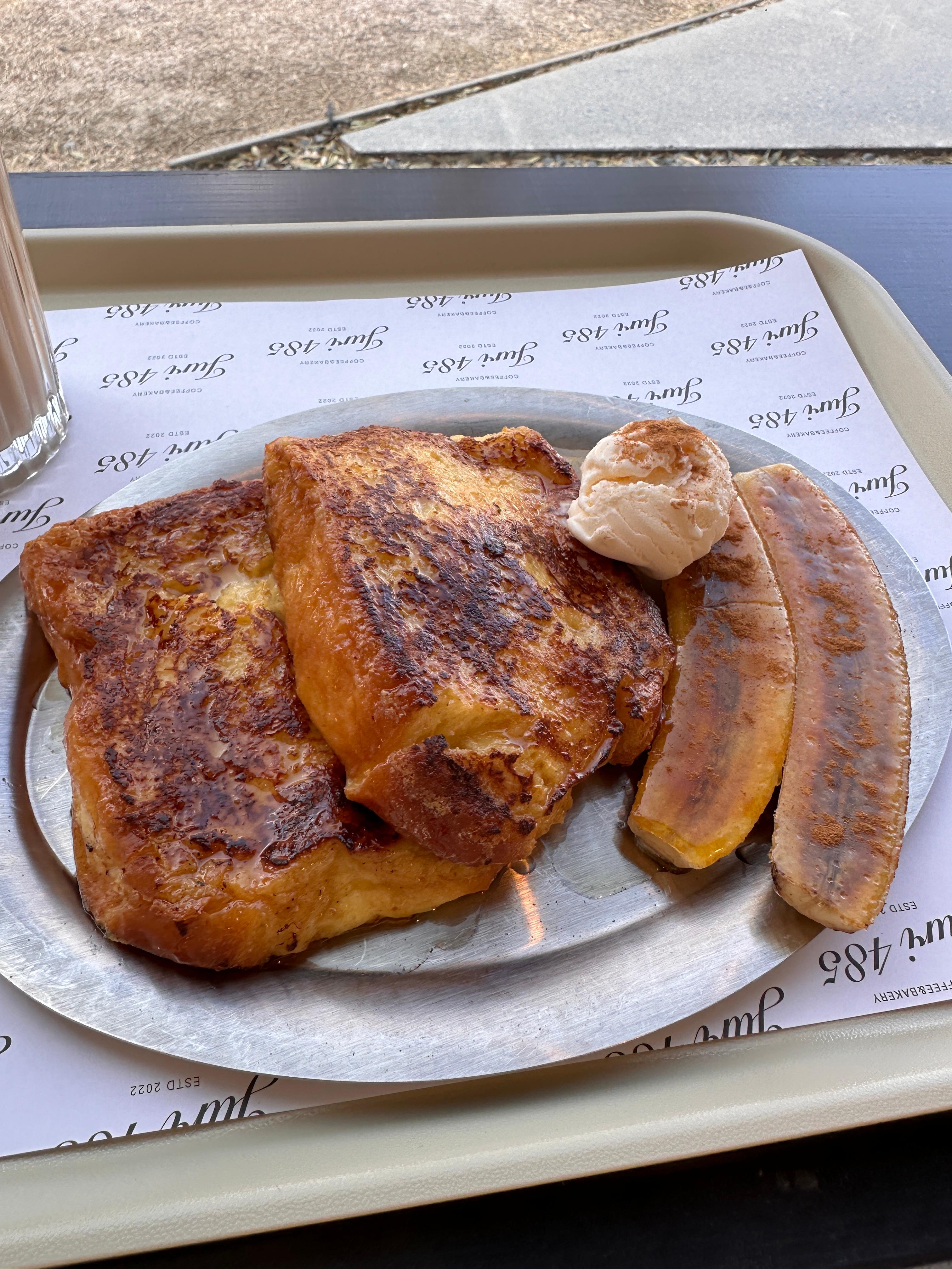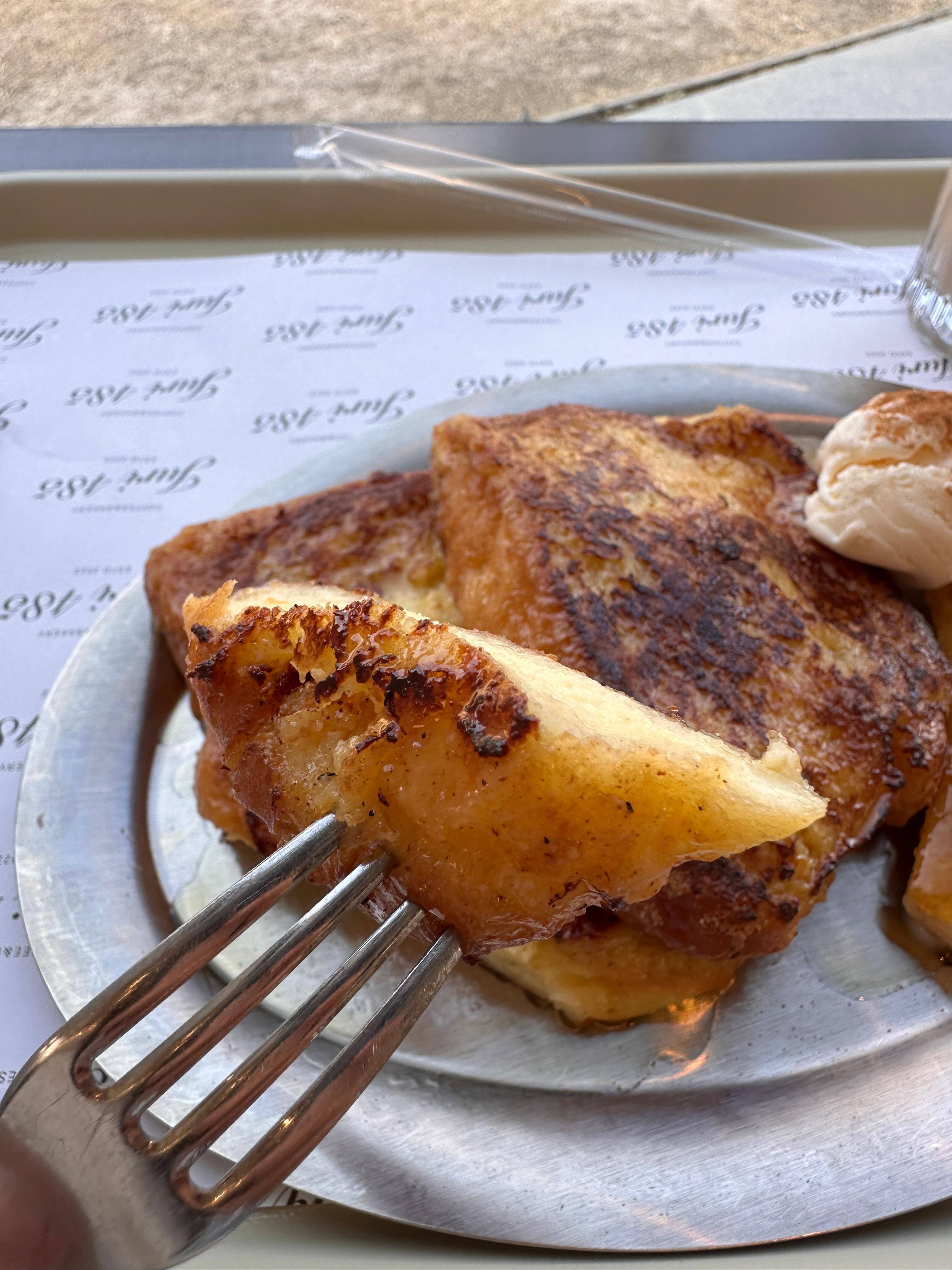 주문 후 조금 기다리니, 예쁜 접시에 담겨 나왔는데요. 겉은 살짝 바삭하고, 안쪽은 촉촉하게 계란물이 스며들어 있어서 비주얼부터 마음에 쏙 들었습니다. 여기에 달콤한 시럽이나 과일 토핑이 곁들여져, 한눈에 봐도 ‘브런치’를 제대로 즐기고 있다는 느낌이었죠. 포크로 살짝 눌러보면 쫄깃하게 부풀어오른 빵이 부드럽게 잘 잘렸고, 한입 먹으니 계란의 고소함과 달콤한 시럽이 입안을 가득 채워줬어요. 살짝 버터 풍미도 느껴져서, 무겁지 않으면서도 꽤 든든한 한 끼 느낌이었습니다.