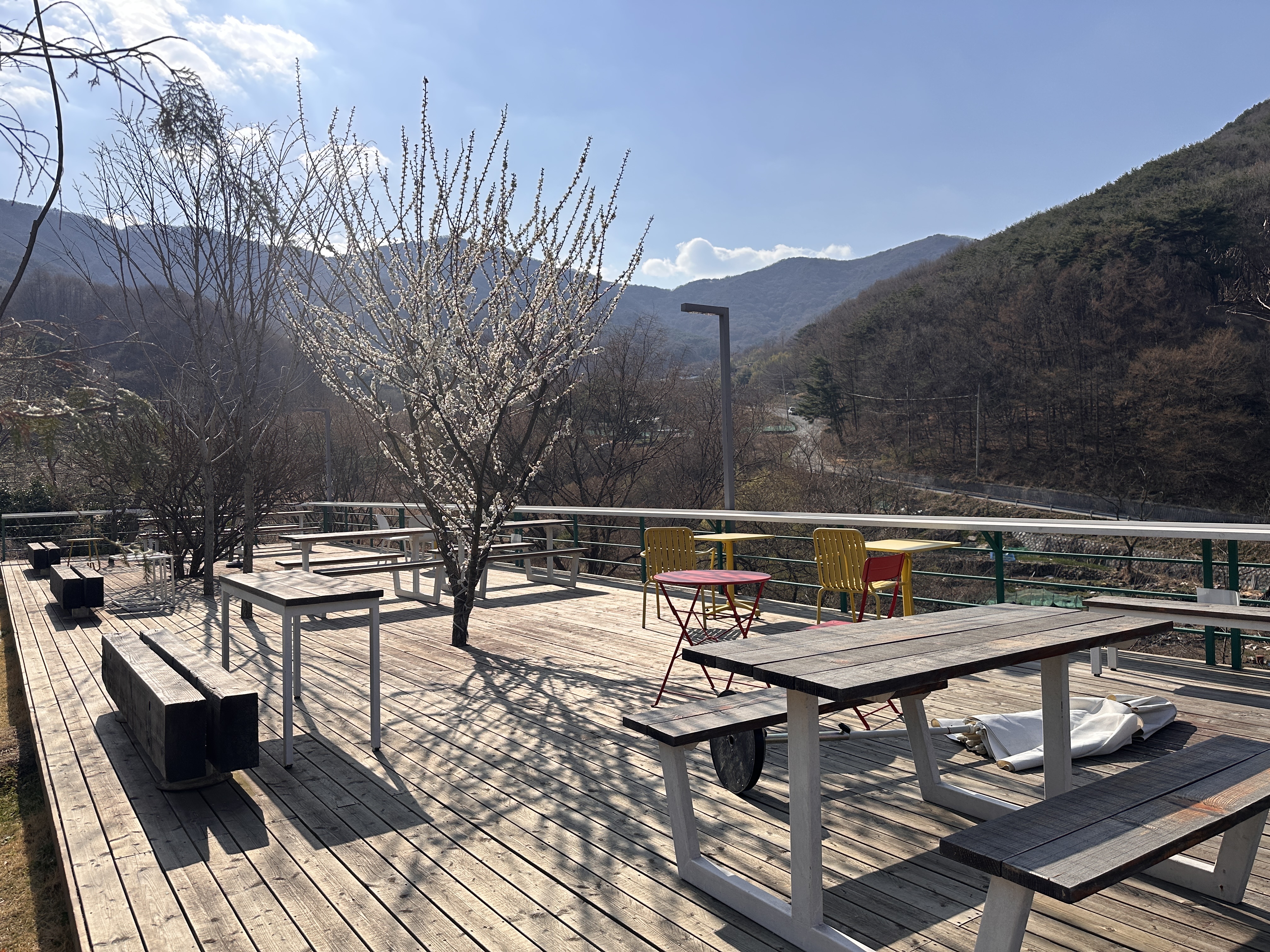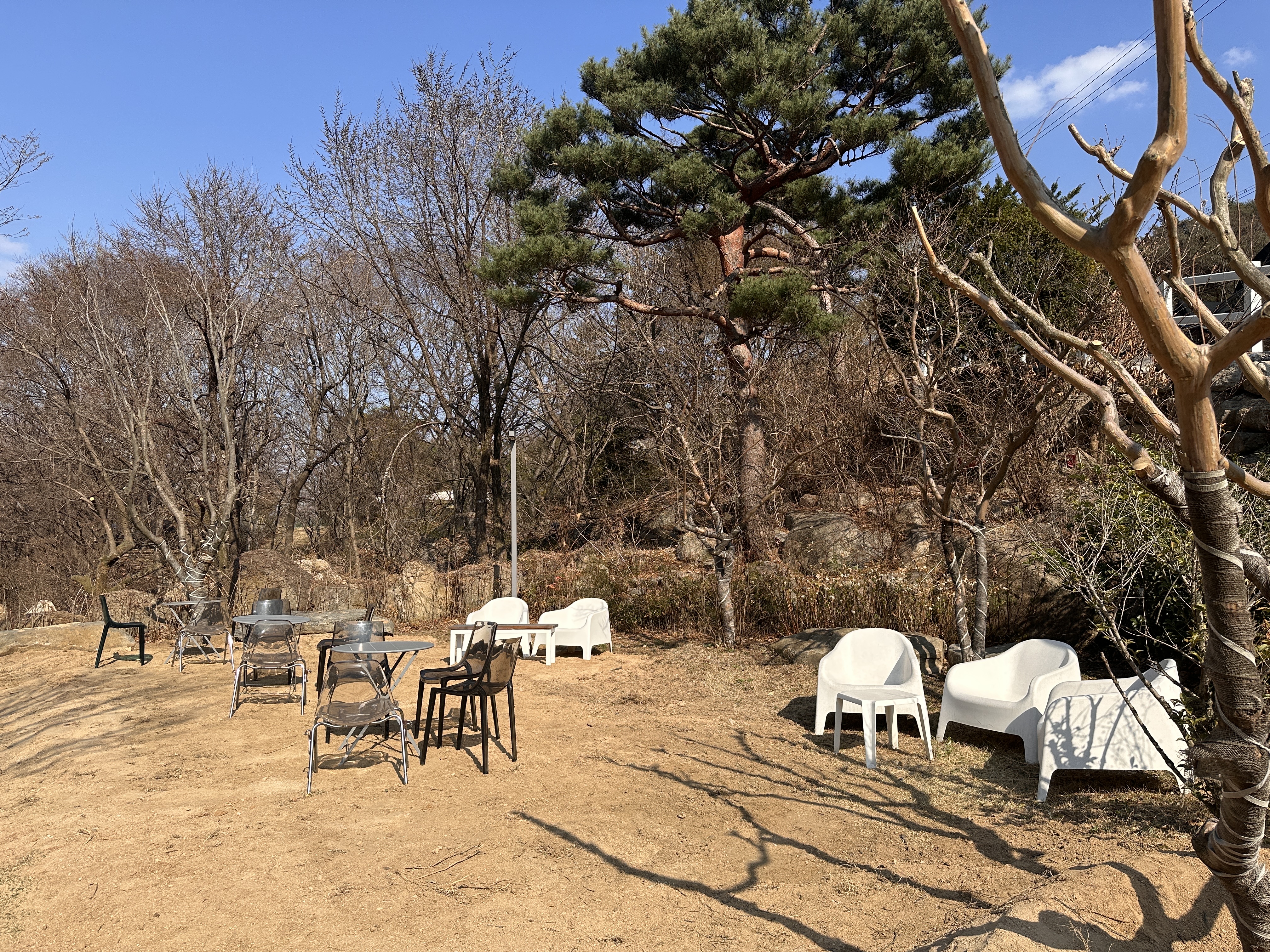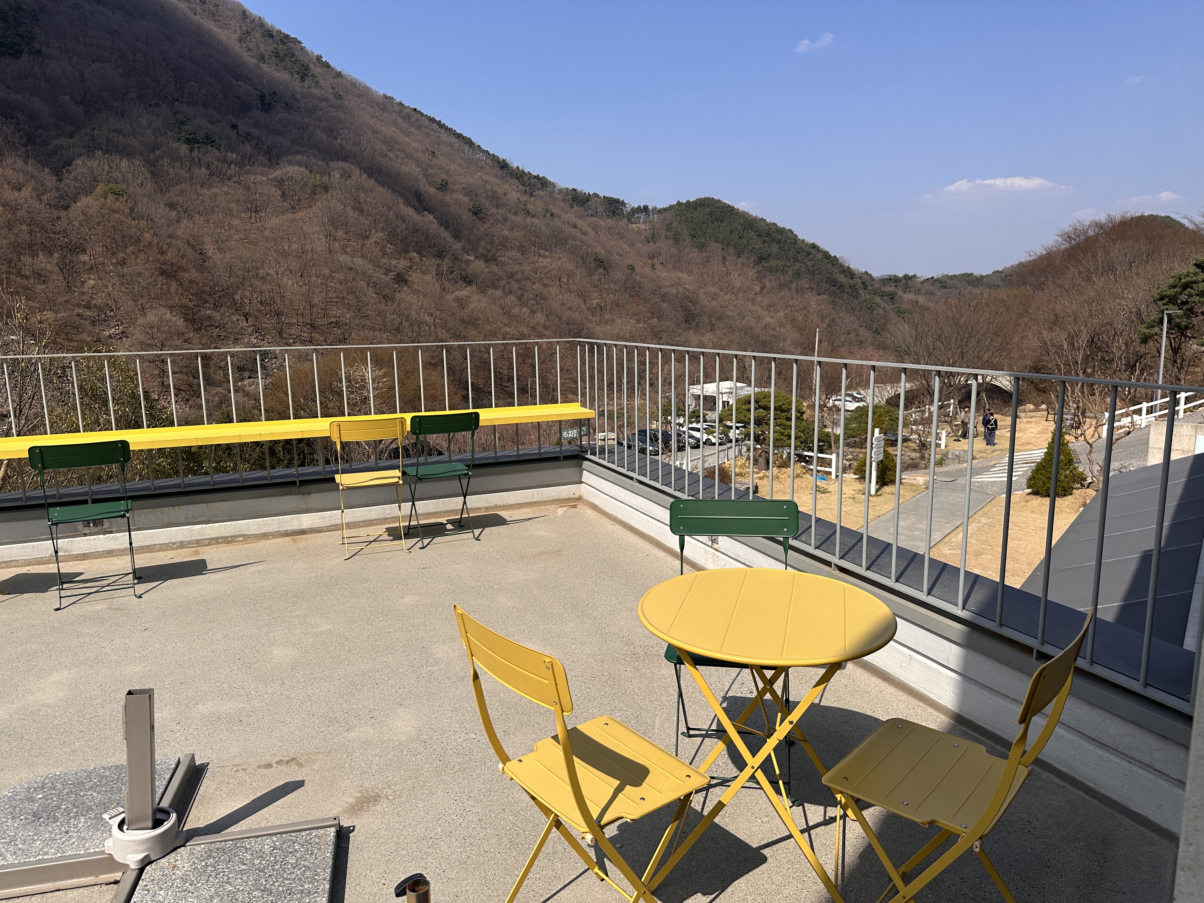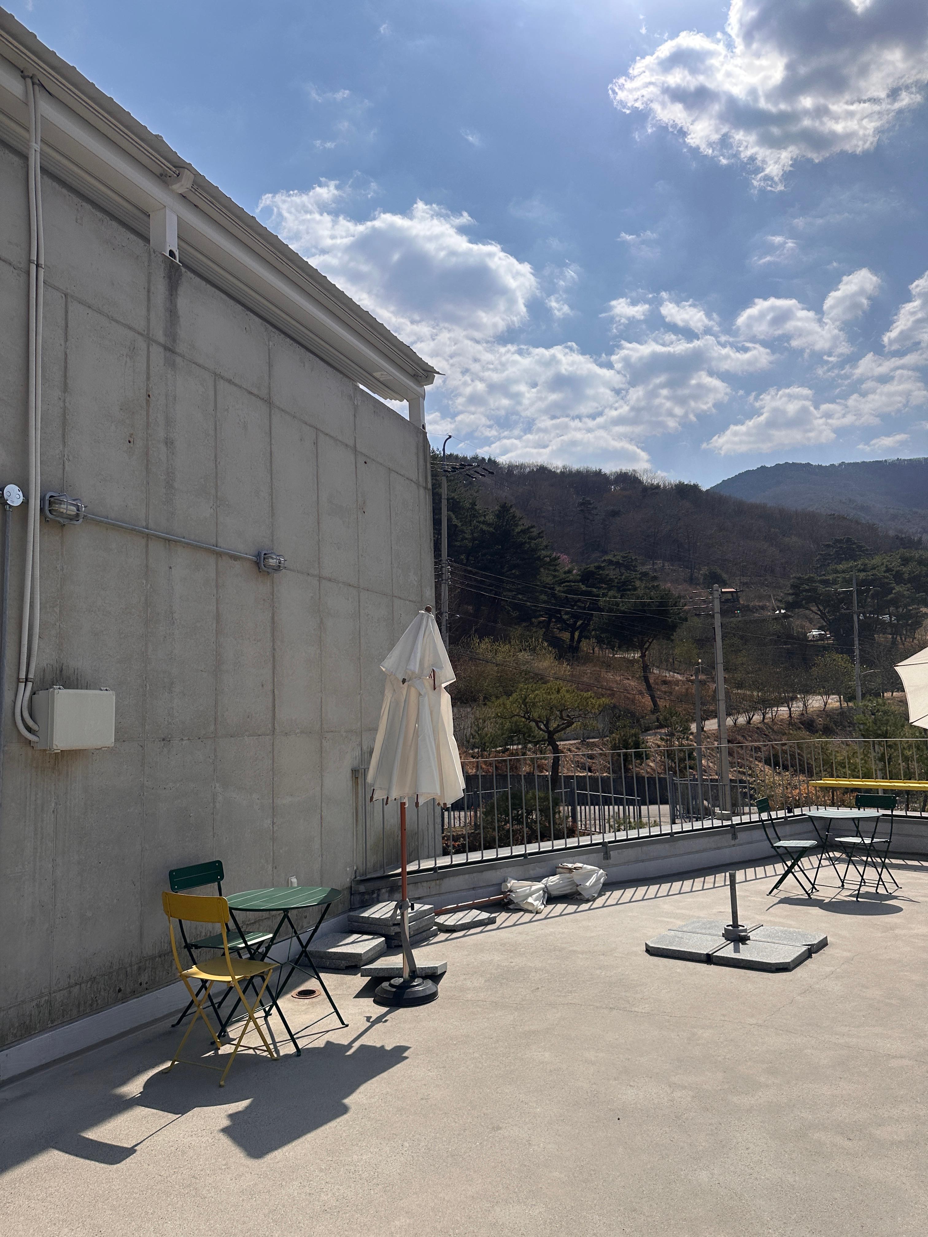 혹시나 해서 밖을 둘러보니, 카페 밖에도 탁 트인 풍경과 함께 넓은 야외 공간이 있더군요. 날이 조금 선선하면 야외 테이블에 앉아도 좋을 듯했어요. 주변에 산이 살짝 보이고, 가창 특유의 고즈넉한 풍광이 카페와 어우러지는 모습이 정말 보기 좋았습니다. “다음엔 날씨가 더 좋을 때 와서 야외에서 커피를 마셔봐야겠다”라는 생각이 들었습니다.